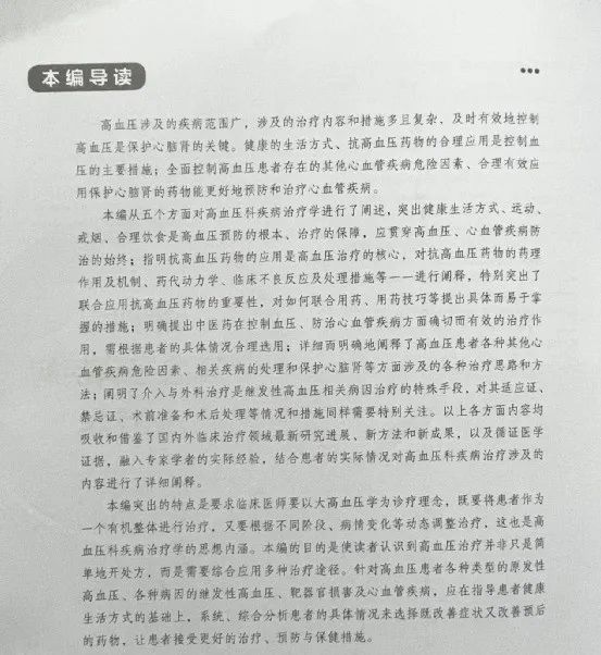 該書每一編都有一個導讀,指導讀者怎樣學習使用相關內(nèi)容,在閱讀每編、章、節(jié)前都能構建好系統(tǒng)的理論知識框架,順利把握好各章節(jié)中的重點、難點及疑點,更好地汲取書中的教學方法及研究成果。如第四編“高血壓科疾病治療學”從健康生活方式、抗高血壓藥物、中醫(yī)藥、相關疾病處理和介入與外科手術等五個方面對高血壓科疾病治療學進行了闡述。反映了高血壓涉及的疾病范圍廣,涉及的治療內(nèi)容和措施多且復雜,及時有效地控制高血壓是保護心腦腎的關鍵。健康的生活方式、抗高血壓藥物的合理應用是控制血壓的主要措施;全面控制高血壓患者存在的其他心血管疾病危險因素、合理有效應用保護心腦腎的藥物能更好地預防和治療心血管疾病。