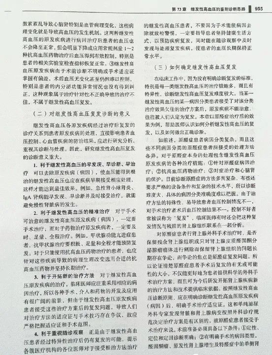 本書提出了繼發(fā)性高血壓復發(fā)的概念:繼發(fā)性高血壓在接受有效處理方法后達到了治愈效果者,在某種誘因作用下,再次出現(xiàn)該疾病病理與病理生理改變及由此產(chǎn)生臨床表現(xiàn)和相關實驗室檢查結果異常,這就表明繼發(fā)性高血壓復發(fā)。讓人們清晰地認識到對于繼發(fā)性高血壓復發(fā)診斷的意義:①利于繼發(fā)性高血壓的早發(fā)現(xiàn)、早診斷、早治療;②利于繼發(fā)性高血壓的精準治療;③利于認識和評價新的診療方法開拓的價值和意義;④利于重視繼發(fā)性高血壓患者的隨診觀察。