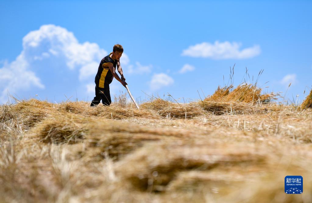 7月3日,寧夏固原市原州區(qū)炭山鄉(xiāng)炭山村村民在整理麥稈。新華社記者 馮開華 攝