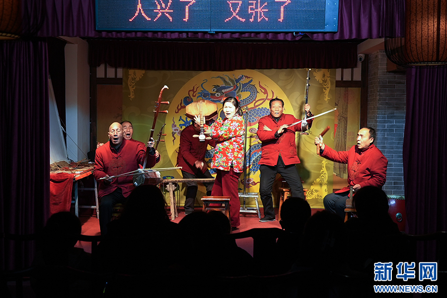 在西安永興坊——陜西非遺文化特色街區(qū),今年69歲的楊啟民(右二)和“華陰市衛(wèi)峪老腔藝術團”的其他老藝人表演國家級非遺華陰老腔《關中古歌》。新華網(wǎng) 楊喜龍 攝
