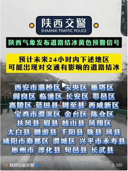 預(yù)計(jì)未來24小時(shí)內(nèi)下述地區(qū)可能出現(xiàn)對(duì)交通有影響的道路結(jié)冰:西安市灞橋區(qū)、未央?yún)^(qū)、雁塔區(qū)、閻良區(qū)、臨潼區(qū)、長安區(qū)、鄠邑區(qū)、高陵區(qū)、藍(lán)田縣、周至縣、西咸新區(qū),寶雞市渭濱區(qū)、金臺(tái)區(qū)、陳倉區(qū)、扶風(fēng)縣、眉縣、岐山縣、鳳翔區(qū)、太白縣、麟游縣、千陽縣、隴縣、鳳縣,咸陽市秦都區(qū)、渭城區(qū)、興平市、武功縣、三原縣、涇陽縣、禮泉縣、乾縣、永壽縣、彬州市、淳化縣、旬邑縣、長武縣,銅川市王益區(qū)、印臺(tái)區(qū)、耀州區(qū)、宜君縣,渭南市臨渭區(qū)、華陰市、華州區(qū)、潼關(guān)縣、大荔縣、澄城縣、合陽縣、蒲城縣、富平縣、白水縣,延安市寶塔區(qū)、安塞區(qū)、黃陵縣、黃龍縣、宜川縣、洛川縣、富縣、甘泉縣、吳起縣、志丹縣、子長市、延川縣、延長縣,榆林市榆陽區(qū)、橫山區(qū)、神木市、府谷縣、定邊縣、靖邊縣、綏德縣、米脂縣、佳縣、吳堡縣、清澗縣、子洲縣,漢中市南鄭區(qū)、城固縣、洋縣、勉縣、西鄉(xiāng)縣、略陽縣、鎮(zhèn)巴縣、寧強(qiáng)縣、留壩縣、佛坪縣,安康市漢濱區(qū)、漢陰縣、石泉縣、寧陜縣、紫陽縣、嵐皋縣、平利縣、鎮(zhèn)坪縣、旬陽市、白河縣,商洛市商州區(qū)、洛南縣、山陽縣、鎮(zhèn)安縣、丹鳳縣、商南縣、柞水縣,楊凌示范區(qū)楊陵區(qū),韓城市,請(qǐng)注意防范。